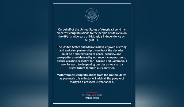 KUALA LUMPUR,1 September- Amerika Syarikat (AS) menyampaikan ucapan tahniah kepada Malaysia sempena sambutan Hari Kebangsaan ke-68.