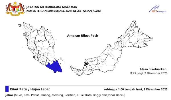 KUALA LUMPUR,2 Disember - MetMalaysia mengeluarkan amaran ribut petir,hujan lebat dan angin kencang di dua negeri di seluruh Melaka dan Johor hingga pukul 2 petang ini.